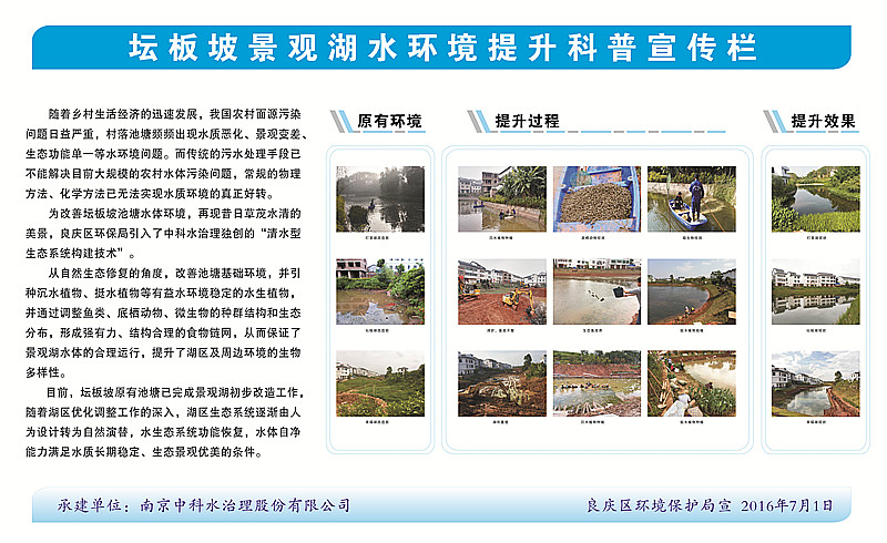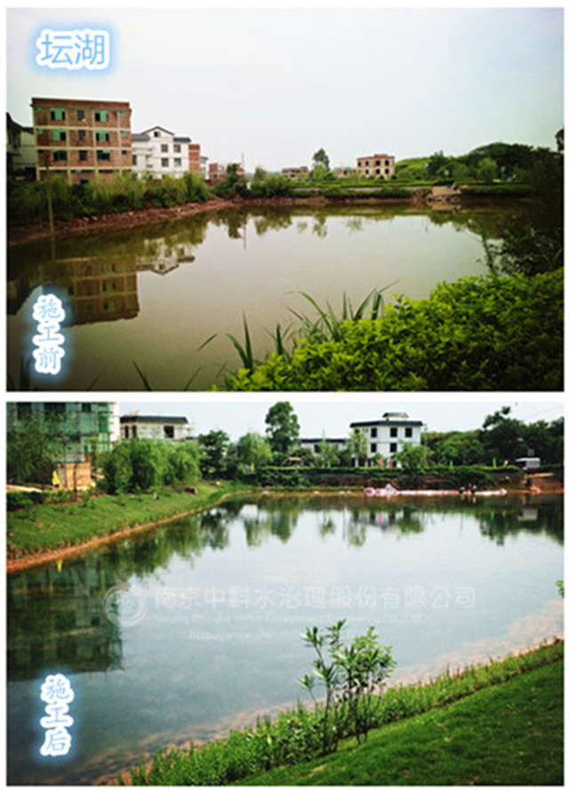 2015年12月12日,中科水治理參與的壇板坡景觀湖水生態(tài)構(gòu)建工程正式開工,景觀湖位于中心街區(qū)的東部,分為壇湖和板湖兩個(gè)獨(dú)立的水體,是典型的農(nóng)村污染型水體。水體總面積約15畝,平均水深1.5米,采用中科水治理獨(dú)創(chuàng)的“清水型生態(tài)系統(tǒng)構(gòu)建技術(shù)”,主要建設(shè)內(nèi)容包括基底改良、湖形重塑、微生物菌種投放、沉水植物群落構(gòu)建、挺水、浮葉植物群落構(gòu)建、魚類放養(yǎng)、大型底棲動(dòng)物投放等。2016年3月30日,項(xiàng)目順利通過(guò)驗(yàn)收。